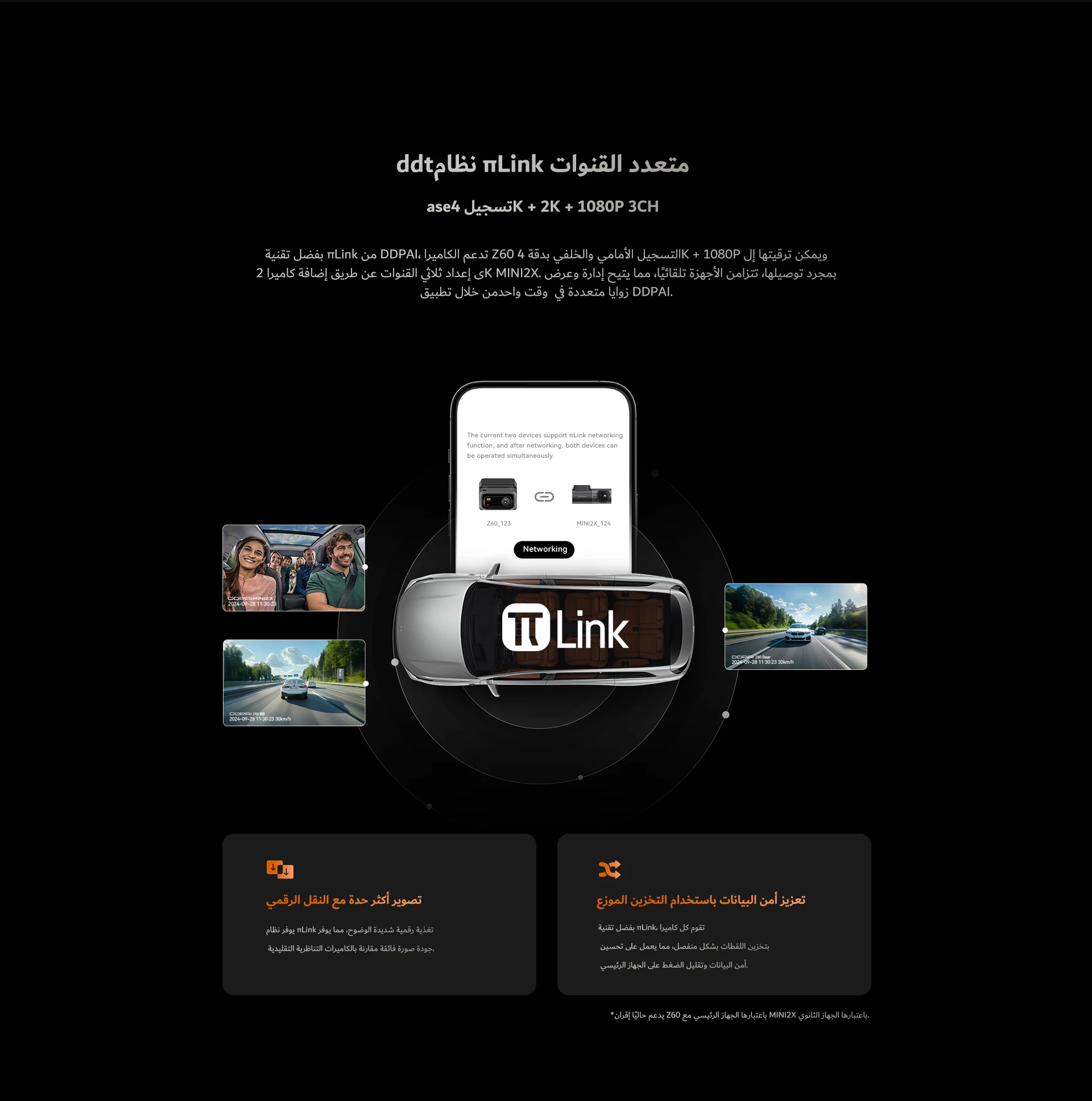 يدعم Z60 التسجيل الأمامي والخلفي بدقة 4K + P ويمكن ترقيته إلى إعداد 3 قنوات مع كاميرا إضافية 2K MiNl2X باستخدام تقنية rLink DDPAl. بمجرد توصيل الأجهزة تلقائيًا ، مما يسمح لك بإدارة وعرض زوايا متعددة في وقت واحد من خلال تطبيق DDPAl.