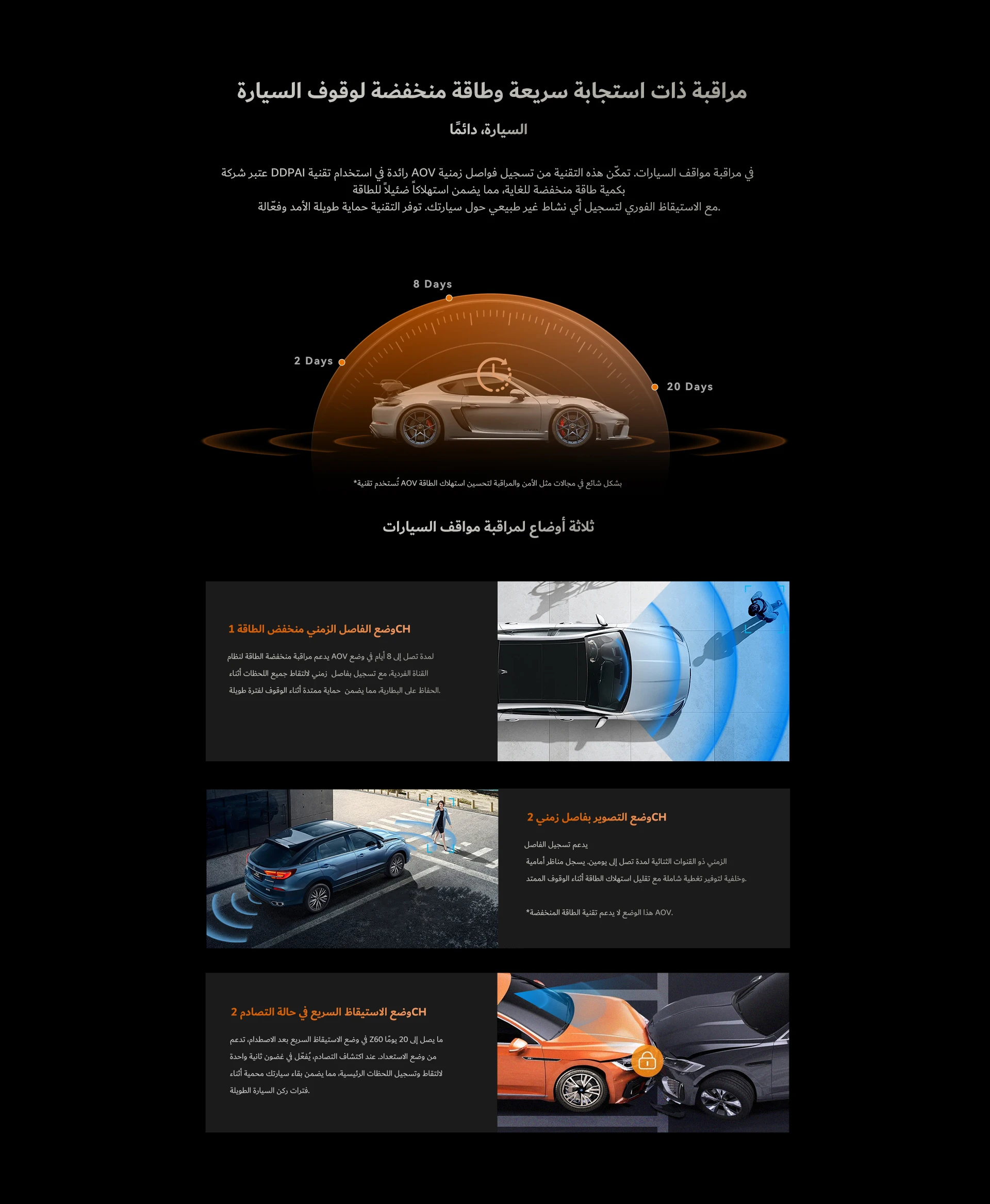 تقنية AOV لمراقبة مواقف السيارات رائدة في استخدام تقنية AOV في مراقبة مواقف السيارات ، هذه التكنولوجيا تمكن تسجيل الوقت الفاصل بين الطاقة المنخفضة للغاية ، ضمان الحد الأدنى من الاستهلاك أثناء الاستيقاظ الفوري لأي نشاط غير طبيعي حول سيارتك ، مما يضمن حماية طويلة الأمد وفعالة.