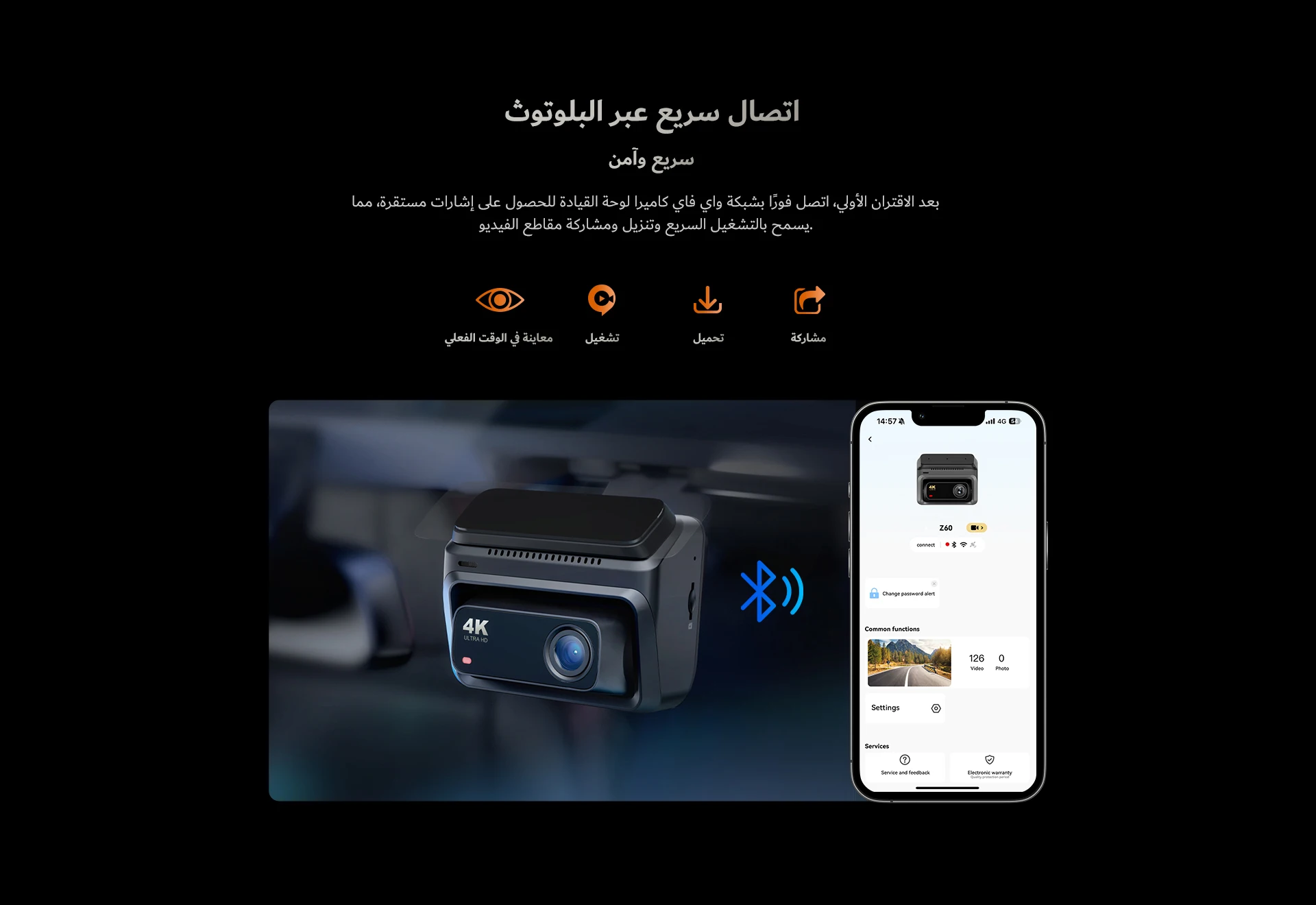 بعد الاقتران الأولي ، اتصل على الفور بكاميرا داش كام واي فاي لإشارات ثابتة تسمح بتشغيل وتنزيل ومشاركة مقاطع الفيديو بسرعة.