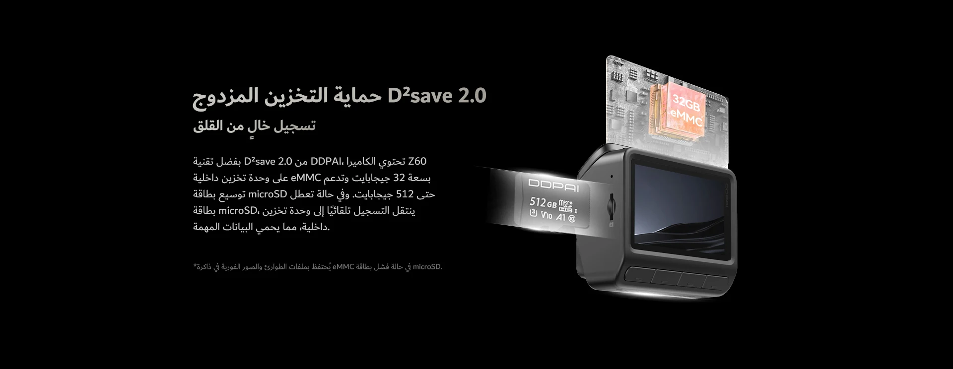 مع تقنية DDPAl d d-save ، يشتمل z60 على تخزين داخلي 32 جيجابايت eMMC ويدعم حتى عرض microSD GB. فشل بطاقة microSD ، تسجيل أوتوماتيكي للسحرة إلى التخزين الداخلي ، حماية البيانات الهامة.