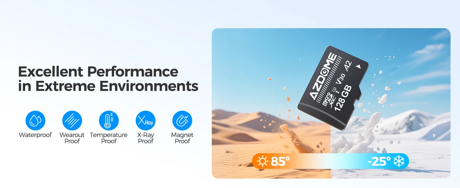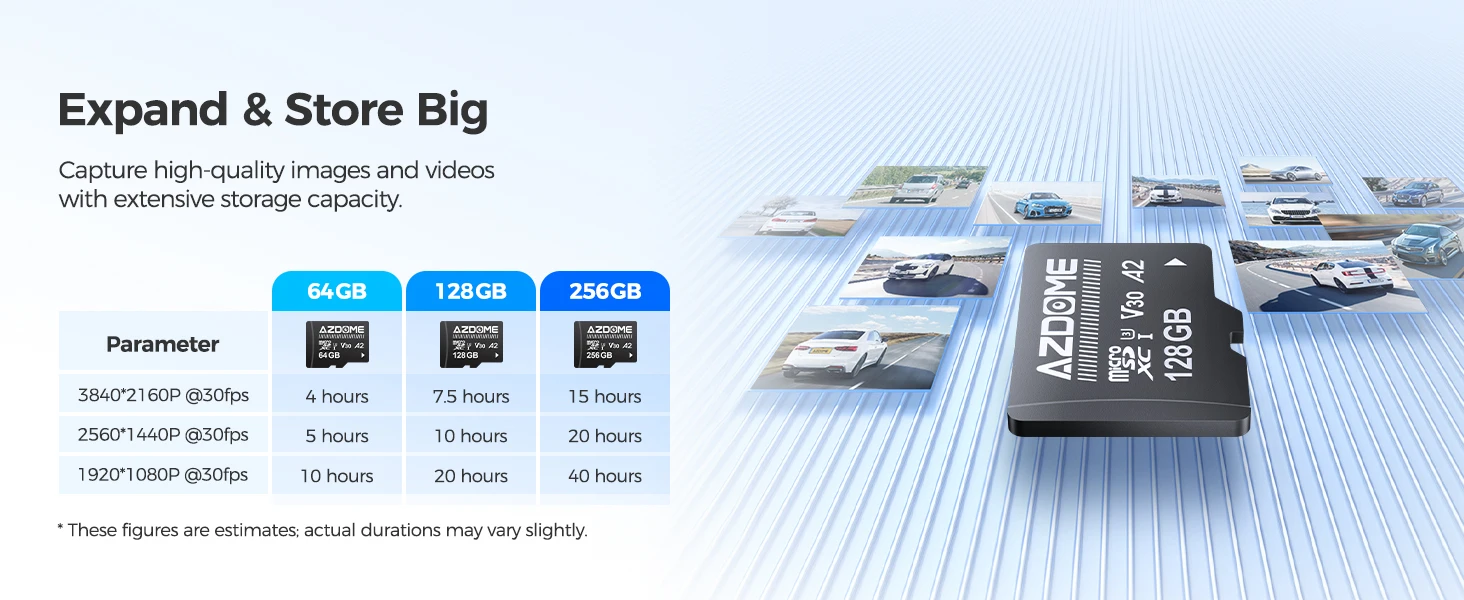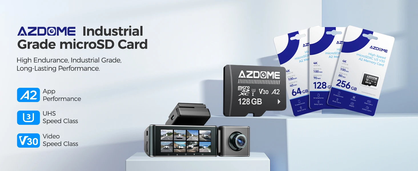 نوصي باستخدام بطاقات AZDOME SD للحصول على الأداء الأمثل.قد لا تكون بطاقة SD التابعة لجهة خارجية هذه قادرة على تلبية متطلبات العمل العادية لكاميرا Dash ذات 3 قنوات.