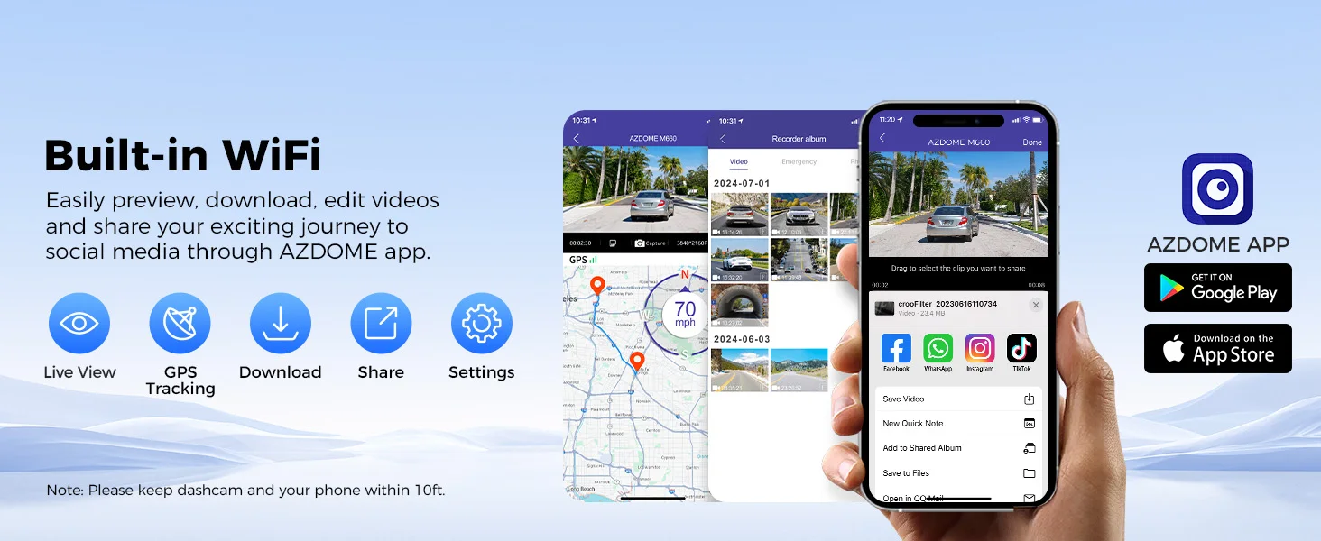 مع اتصال 5G WiFi أسرع بهاتفك الذكي (سرعة نقل أسرع 4 مرات من العادية 2.4 جيجا هرتز)، تتوافق كاميرا M660 Dashcam مع تطبيق AZDOME، مما يسمح لك بالوصول الفوري إلى مقاطع الفيديو والصور المسجلة على هاتفك ومشاركة مشهد السفر واللحظات على الطريق.
