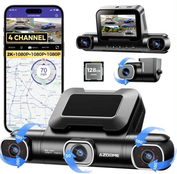 أزدوم 360° كاميرا داش كام 4 قنوات M660 2K + 1K + 1K + 1K داشكام أمامية وخلفية ( داخلية - اليسار واليمين ) مع 4 عدسات قابلة للتعديل DVR نظام تحديد المواقع 5G واي فاي مدمج 128 جيجابايت eMMC التحكم الصوتي 24 ساعة شاشة للمساعدة في ركن السيارة بسهولة رؤية ليلية بالأشعة تحت الحمراء